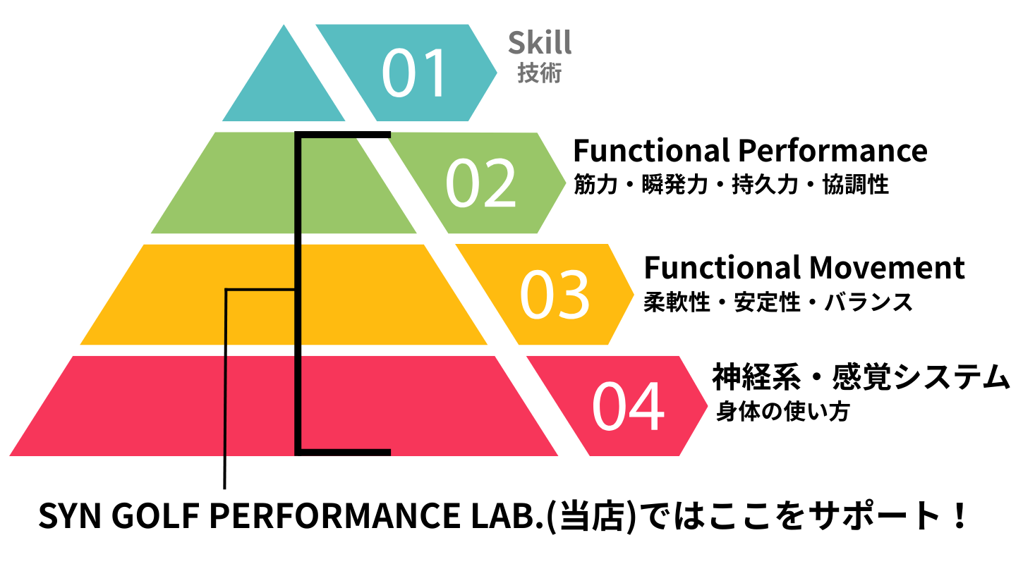 SYN GOLF PERFORMANCE LAB.で出来るゴルフトレーニングは、単一の筋力や柔軟性のみでなく、身体の使い方(モーターコントロール)の改善、全身の協調性・連動性の強化など、身体と動きを変えることで飛距離アップを図ります。自分の身体に合った自然な捻転差や地面反力の使い方を学び、スイングの中で再現できる身体作りが出来るのは、ゴルフ特化型パーソナルトレーニングジムだからこそだと考えています。