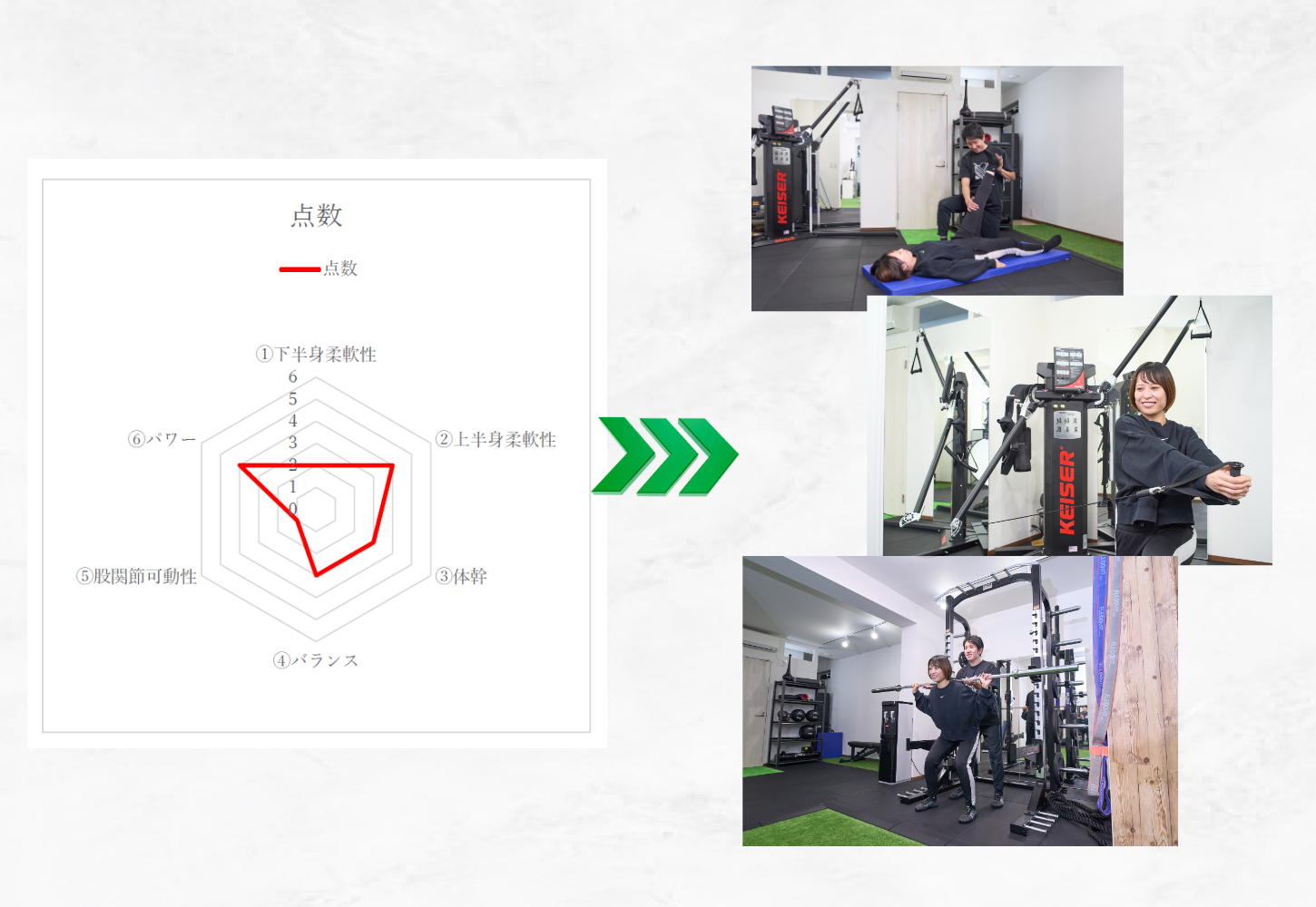 SYNでは豊富な知識と経験を持ったトレーナーが初めにゴルフボディチェックを通して、動作分析+筋力・柔軟性・体幹などスイングに必要な身体機能を評価し、身体機能とゴルフスイングの関係性を明確にします。なぜ飛ばないのか、ショットがばらつくのか、そのようなスイングになるのかを身体の面から解析し、お悩みの改善や目標達成に向けてトレーニングのサポートを行います。