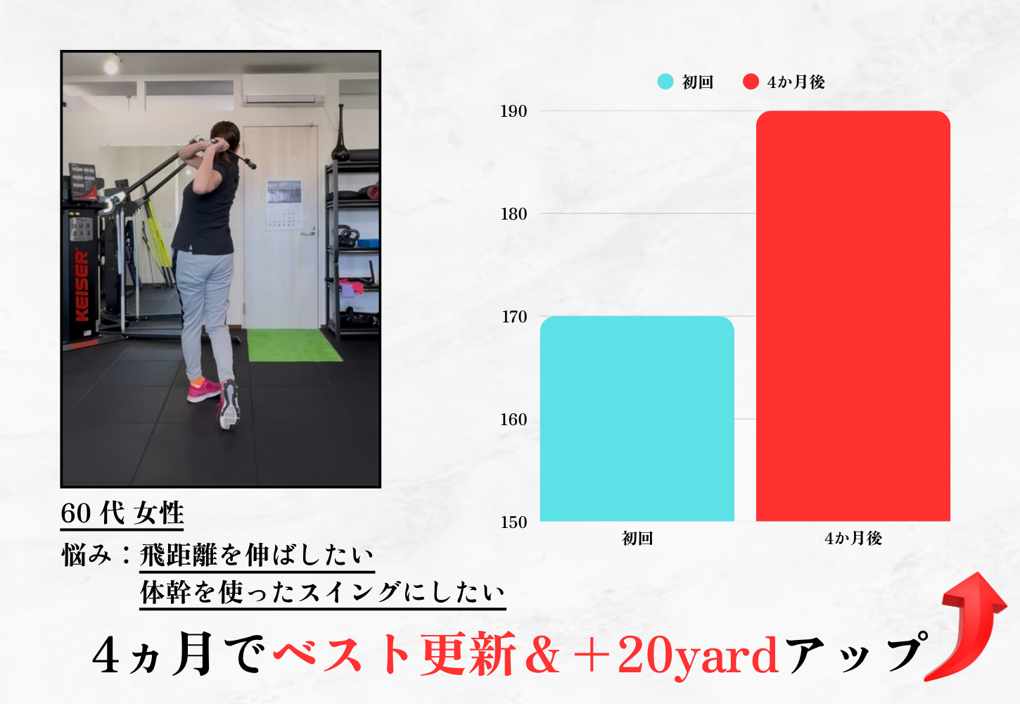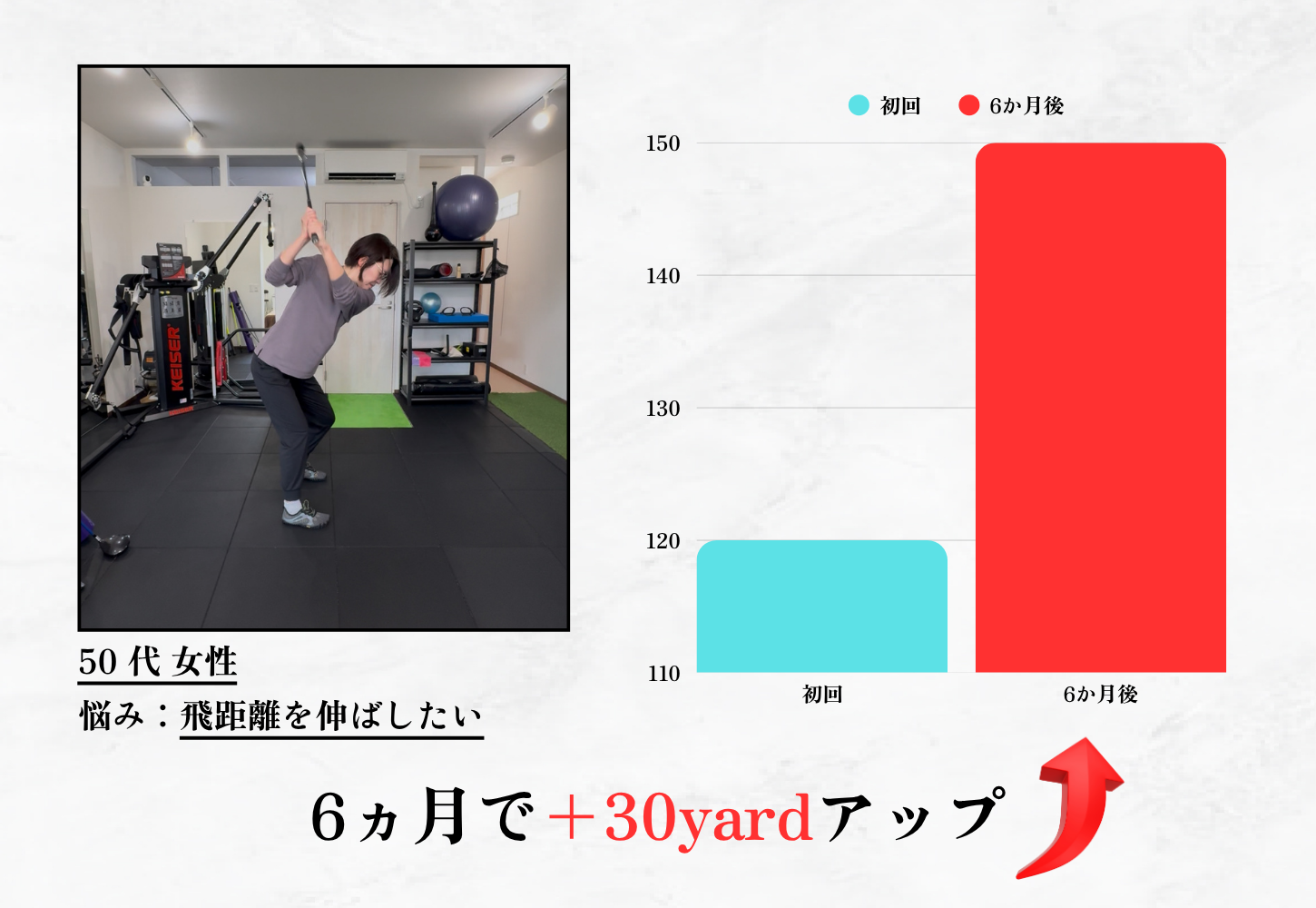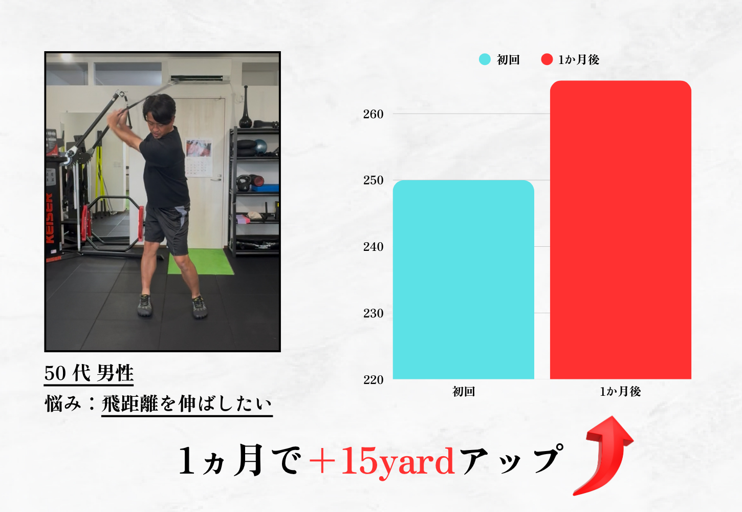 SYNに通うお客様は平均して3~6ヵ月で飛距離アップやベストスコア更新などゴルフへの効果を実感していただいています。SYNが提供するトレーニングは一人ひとりの身体や感覚に合わせてメニューを組み、目的に合わせて身体の要素を作っていくため、自分にあった自然なスイングが身に付き、週1~2回のトレーニングを継続することで30yard以上の飛距離アップをすることも可能です。
