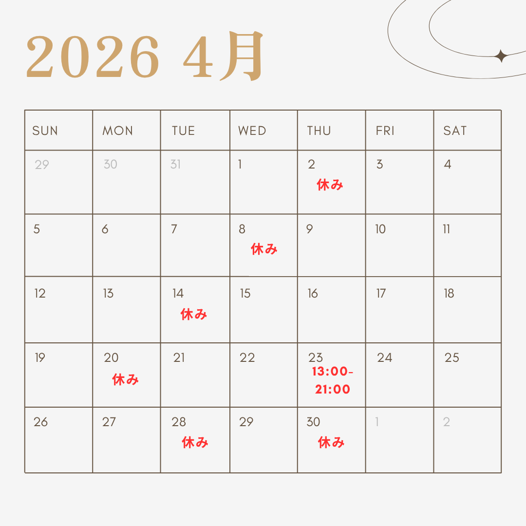 4月営業日は画像の通りとなっております。初回体験の申し込みは先着5名様限定となっております。お申し込みはHPまたは公式LINEよりお願いいたします。