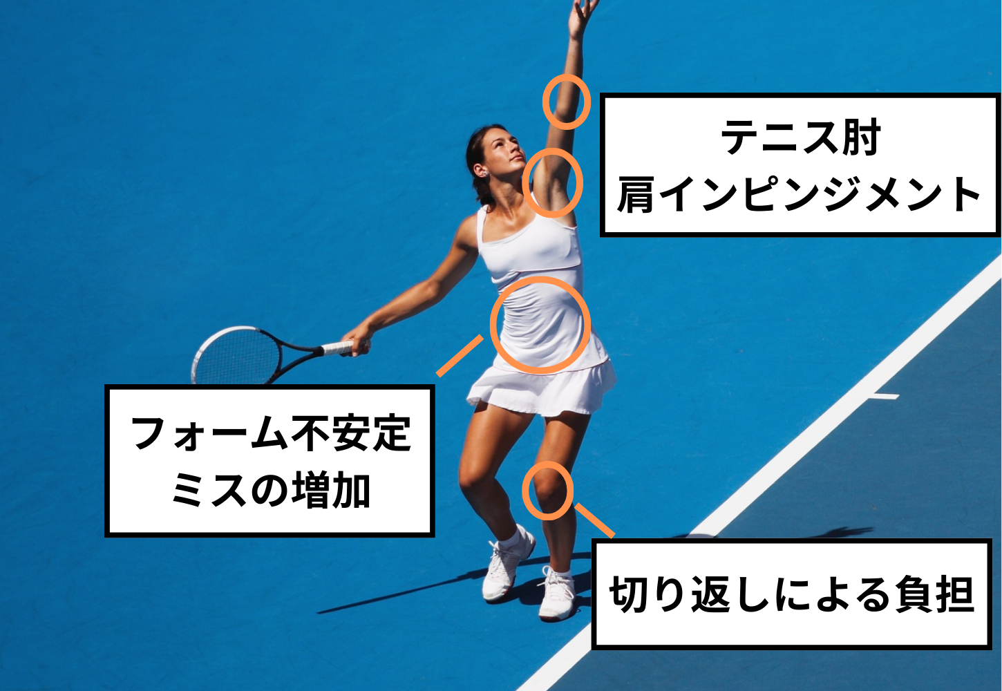 → サーブやストロークの繰り返しで「テニス肘」「肩インピンジメント」が起こりやすい -